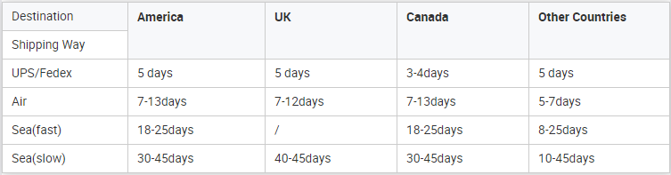 A: Levering av varer i etterkant via UPS, og generelle varer til utenlandsk lager neste dag, vil bli levert til UPS. UPS vil bli levert 3–5 dager etter mottak. Vi vil oppgi ekspressordrenummer og POD for å hjelpe kunder med å sjekke hos Amazon eller UPS.